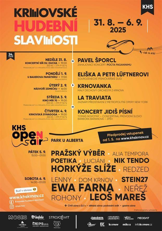 Krnov přináší velký hudební svátek 25.08.2025 | Letní aktivity Petra Dudikova vložila článek 25.08.2025 10:53 Nejrůznější hudební žánry si užijete na 24. ročníku Krnovských hudebních slavností 2025. Od neděle 31. srpna do soboty 6. září vás čeká klasika, opera, dechovka i rock, rap, jazz, pop. V neděli 31. srpna zahájí slavnosti houslista Pavel Šporcl. Jeho koncert Pocta Paganinimu zazní v Koncertní síni Sv. Ducha od 19 hodin. V pondělí 1. září si u Bauerova památníku na pěší zóně poslechnete sourozenecké písničkářské duo Elišku a Petra Lüftnerovy. V úterý 2. září se můžete těšit na nádvoří zámečku na malý dechový orchestr Krnovanka, ve středu 3. září zamířit do kina Mír 70 na přenos opery La Traviata a ve čtvrtek 4. září na Jidiš písně do synagogy. Od rocku po rap, od jazzu k popu – multižánrový koktejl, ve kterém si každý něco najde, pak vypukne v pátek 5. a v sobotu 6. září. Letos v Krnově vystoupí například Ewa Farna, Lenny, Leoš Mareš, Poetika, Horkýže slíže a další čeští umělci. | |