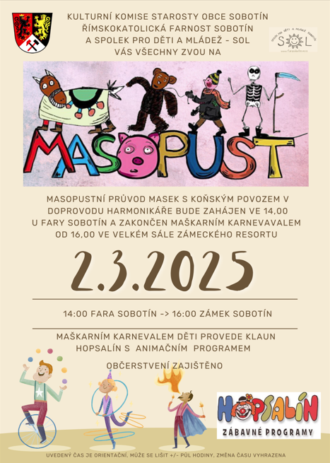 Masopustní veselí Napříč jesenickými horami o víkendu ožije také tradice masopustu. Masopustního reje, veselých zpěvů a hodokvasu se můžeš v sobotu 1. března zúčastnit v Loučné nad Desnou, České Vsi u Jeseníku, ve Zlatých Horách nebo ve Starém Městě u Bruntálu. Masopustní průvod s koňským povozem projde v neděli i Sobotínem a bude zakončen na sobotínském zámku maškarním karnevalem pro děti.