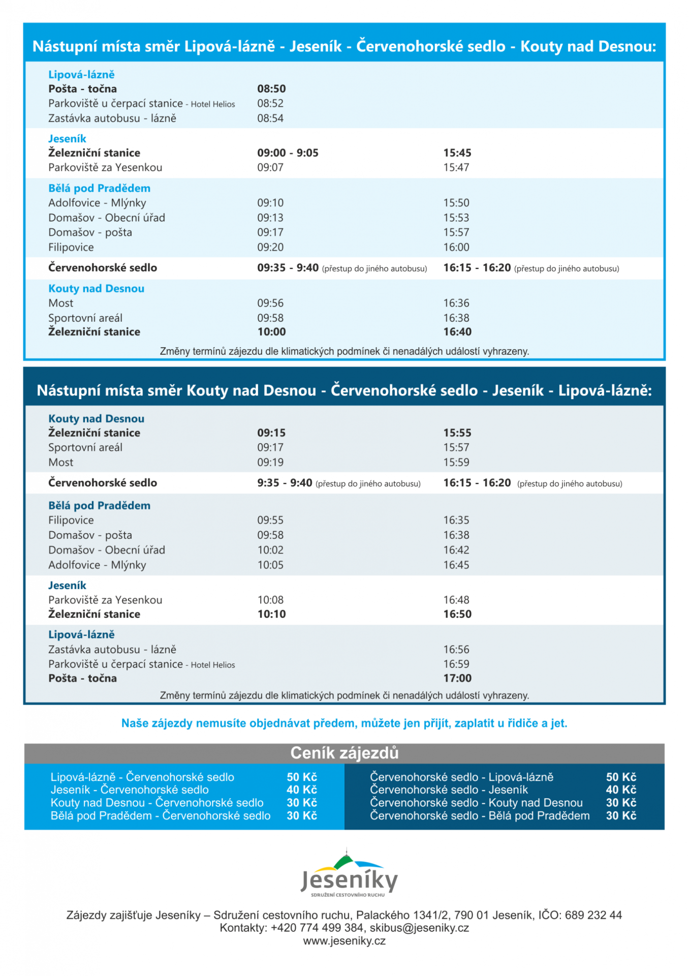 Termíny zájezdů v roce 2020:4. – 5. ledna, 11. – 12. ledna, 18. – 19. ledna, 25. – 26. ledna, 1. – 2. února, 8. – 9. února, 15. – 16. února, 22. – 23. února, 29. února – 1. března, 7. – 8. března, 14. – 15. března KAŽDÝ VÍKEND!Naše zájezdy nemusíte objednávat předem, můžete jen přijít, zaplatit u řidiče a jet. Změny termínů zájezdu dle klimatických podmínek či nenadálých událostí vyhrazeny. Příklady cen jízdného:Lipová-lázně - Červenohorské sedlo 50 Kč Podrobný jízdní řád najdete ve fotografiích. Seznam zastávek a jejich umístění:Lipová lázně Jeseník Bělá pod Pradědem Červzenohorské sedlo Kouty nad Desnou Seznam všech zastávek na Mapy.cz. Kontakt: Ke stažení