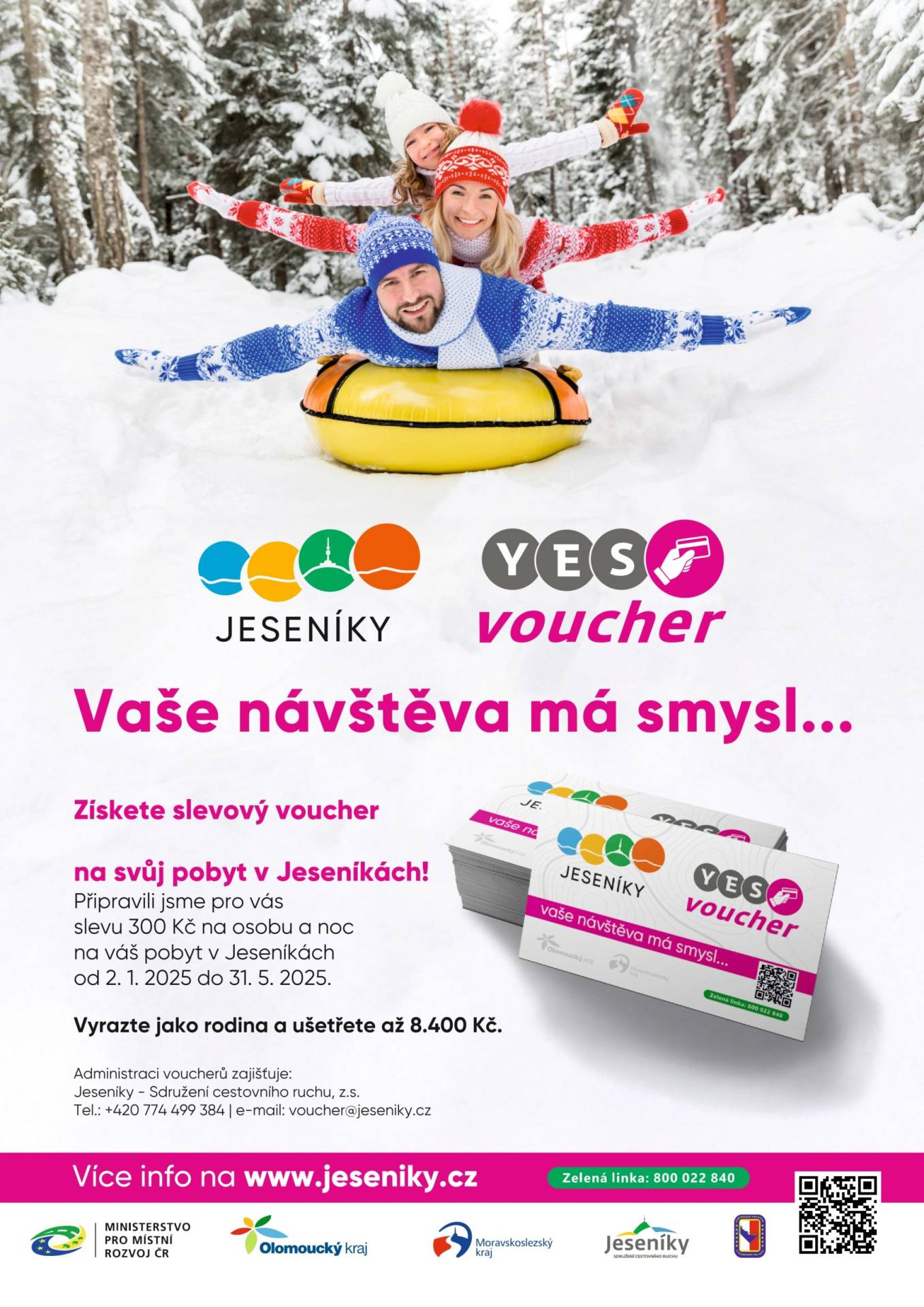 SLEVOVÝ VOUCHER aneb Vaše návštěva má smyl! 02.12.2024 | Ostatní Michal Sedlák vložil článek 18.12.2024 10:46 Cestovní ruch v Jeseníkách se po ničivé zářijové povodni zcela zastavil. K tomu, abychom jej vrátili zpět do normálu, je zapotřebí spojení podpory ze strany státu, krajů, organizační destinačního managementu, měst, obcí a podnikatelů. Sekundární dopady povodně totiž zasáhly právě i podnikatele, kteří nebyli přímo zasáhnutí povodní, avšak škody vzniklé zastavením turismu jsou pro ně zcela fatální. Podobný scénář je již znám a vyzkoušen v požárem zasaženém v Českém Švýcarsku. Spolehlivou recepturou na návrat turistů tehdy byly slevové vouchery na ubytování. Díky snaze Jeseníky – Sdružení cestovního ruchu a zástupců Olomouckého a Moravskoslezského kraje se podařilo tento model prosadit a velmi rychle aplikovat na případ Jeseníků. Vaši návštěvu podpoří Ministerstvo pro místní rozvoj ČR, Olomoucký kraj a Moravskoslezský kraj možností získat SLEVOVÝ VOUCHER na váš pobyt v Jeseníkách. SLEVOVÝ VOUCHER si můžete aktivovat od 2.1.2025 a můžete jej použít na vámi rezervovaný pobyt u smluvního ubytovatele v období od 2.1.2025 do 31.5.2025 nebo do vyčerpání celkové částky 20.000.000 Kč. Využijte tedy této unikátní možnosti a získejte slevu na ubytování ve výši 300 Kč na osobu a noc při pobytu od minimálně 2 nocí do maximálně 7 nocí. Celkově můžete tak ušetřit 2.100 Kč na osobu. Sleva platí na jednu osobu. V případě čtyřčlenné rodiny můžete při sedmidenním pobytu ušetřit 8.400 Kč. Ubytovatelé mohou již od 16.12.2024 registrovat své ubytovací zařízení, které bude možno akceptovat slevové vouchery. Vouchery bude možné získat ONLINE od 2.1.2025. Více informací na webu voucher.jeseniky.cz | |
