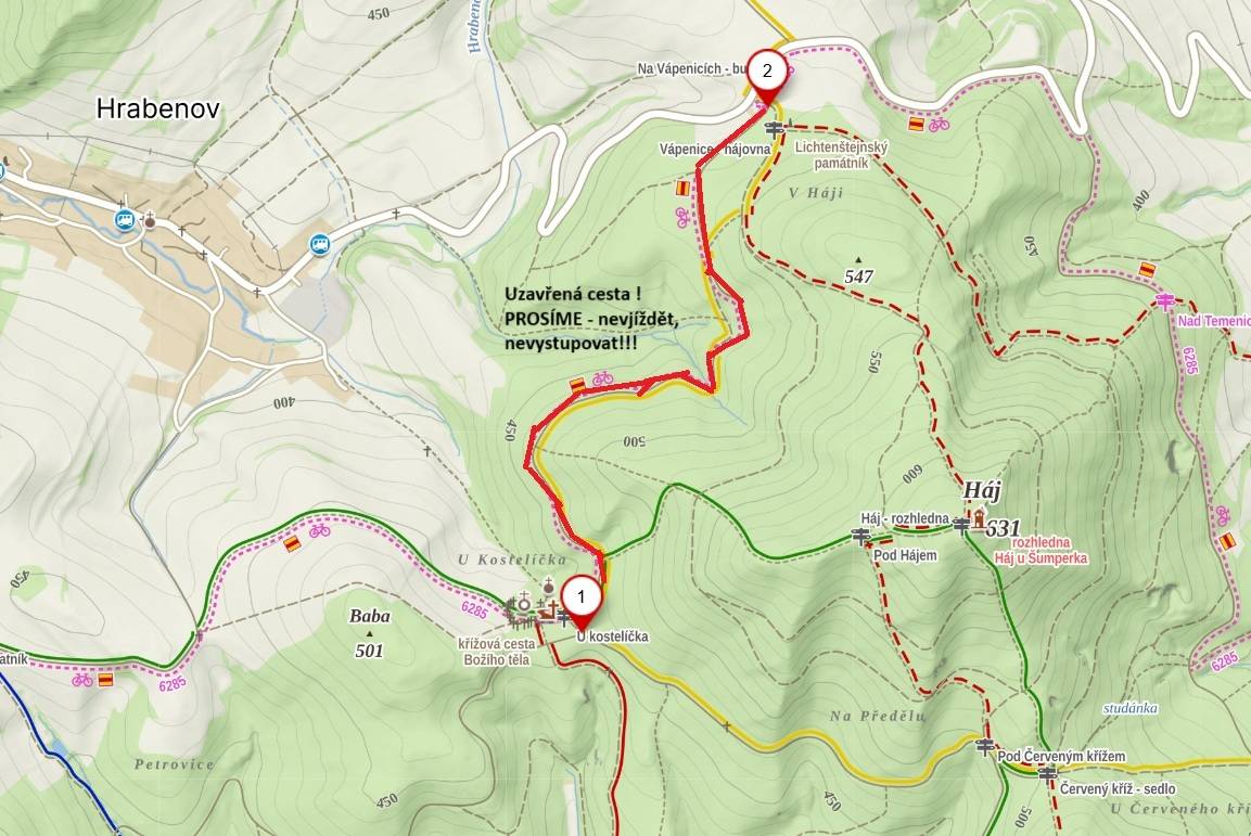 Uzavírka tras u Hrabenova - rekonstrukce lesní cesty Kostelníčka 07.07.2025 | Ostatní Iva Glacová vložila článek 07.07.2025 08:40 Byla zahájena rekonstrukce lesní cesty v blízkosti obce Hrabenov, po které je vedena cyklotrasa KČT ČR Červená cyklo Tulinka – Tulinka (CZT 6285) "K řece Moravě". Oblíbený výletní cyklookruh je v úseku od rozcestí „U Kostelíčka“ po křižovatku „Na Vápenicích“ UZAVŘEN PRO CYKLISTY I PRO PĚŠÍ !!! V tomto úseku se budou pohybovat stavební stroje a hrozí nebezpečí úrazu! Místo je možné na kole objet po místní komunikaci z Hrabenova do Šumperka, obejít poznačené žluté nebo zelené pěší trase KČT ČR. Ke stažení