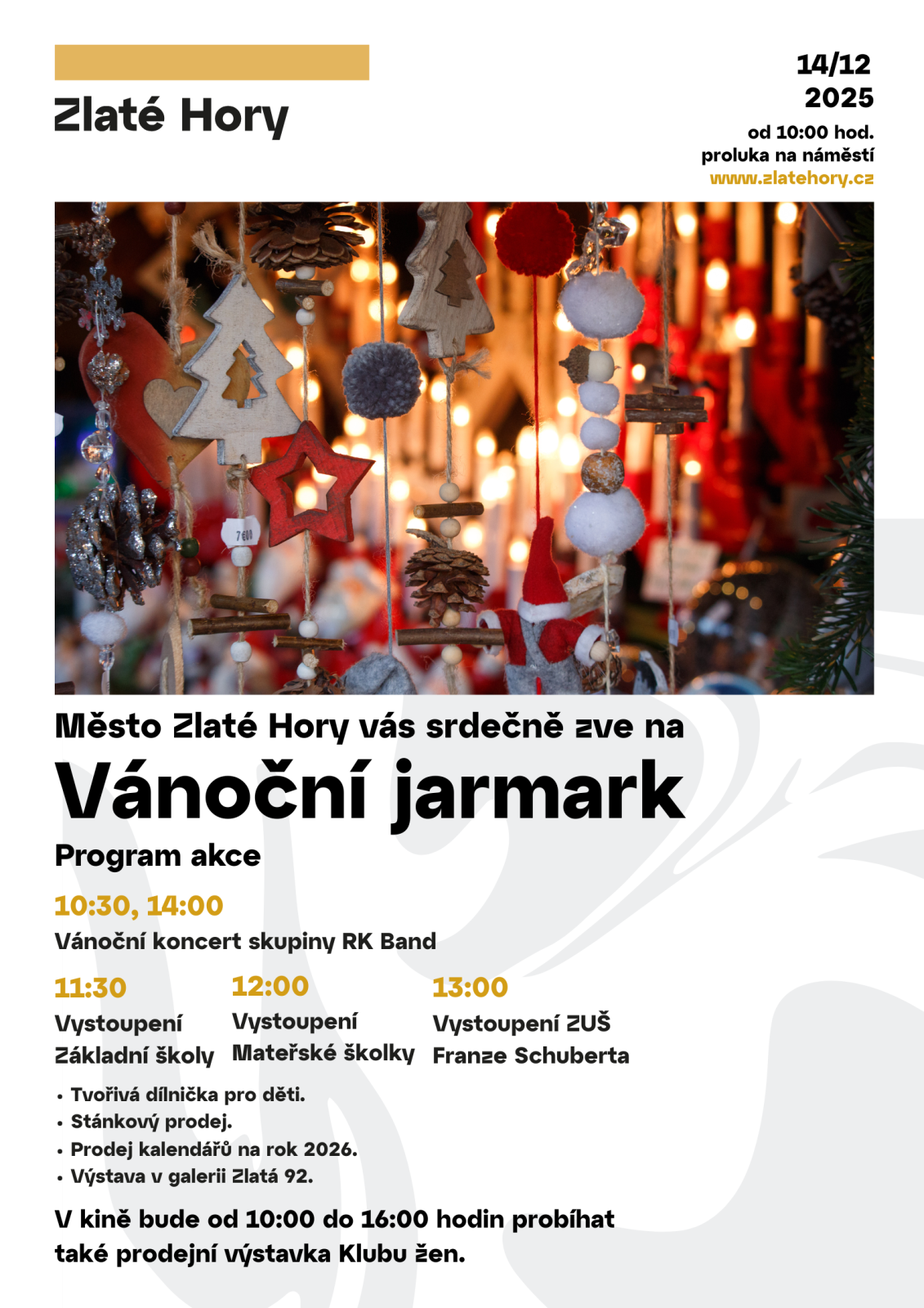 akce v neděli 14. prosince 2025 | Vystoupení ZŠ, MŠ a ZUŠ Franze Schuberta Zlaté Hory. 14.12.2025 od 10:00 do 18:00 hod. nám. Svobody Zlaté Hory, Zlaté Hory | Mapa | | | Tančírna - Račí údolí