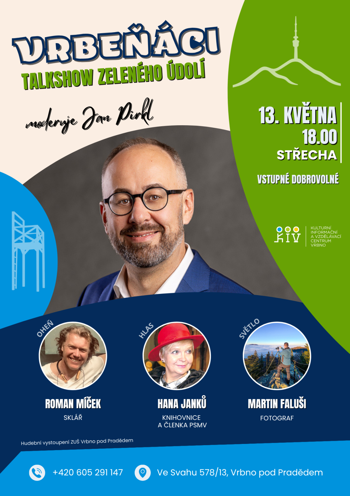 Adresa: Ve Svahu 578 / 13 79326 Vrbno pod Pradědem Bruntál District, Moravian-Silesian Region Czechia Poslední změna: 28.04.2026 | Talkshow zeleného údolí Vrbeňáci - Ostatní 13.05.2026 od 18:00 do 20:00 hod. STŘECHA, Vrbno pod Pradědem | MapaJiž druhá talkshow s názvem Vrbeňáci. Moderuje Jan Pirkl. Další ostatní akce v pondělí 20. dubna 2026 | Každou sobotu, neděli a svátek! Od 20.04.2026 09:29 do 31.12.2026 10:10 hod. Vlakové nádraží Zlaté Hory, Zlaté Hory | Mapa | |