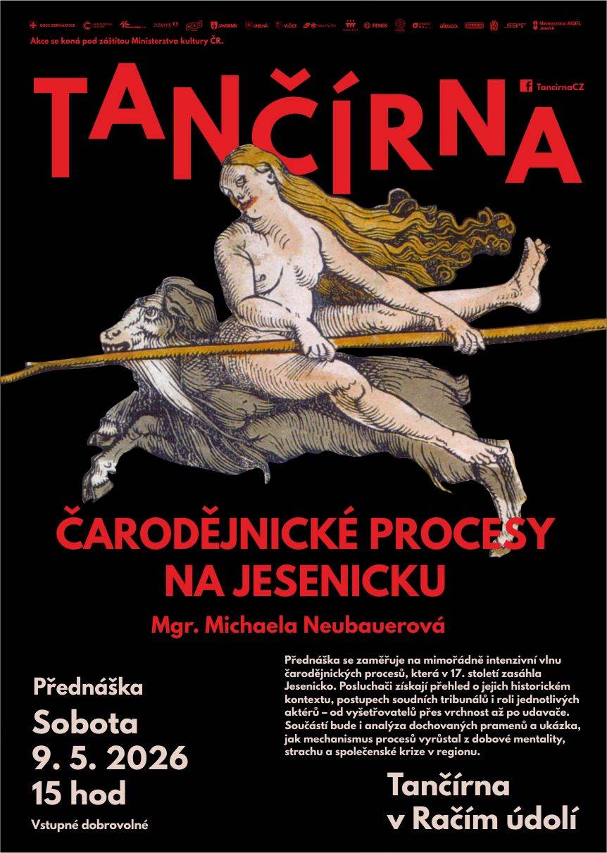 Vstupné dobrovolné Čarodějnické procesy na Jesenicku a Mgr. Michaela Neubauerová (Státní okresní archiv Jeseník) Tančírna - Račí údolí Sobota - 9.5.2026 - 15h Vstupné dobrovolné Přednáška se zaměřuje na mimořádně intenzivní vlnu čarodějnických procesů, která v 17. století zasáhla Jesenicko. Posluchači získají přehled o jejich historickém kontextu, postupech soudních tribunálů i roli jednotlivých aktérů – od vyšetřovatelů přes vrchnost až po udavače. Součástí bude i analýza dochovaných pramenů a ukázka, jak mechanismus procesů vyrůstal z dobové mentality, strachu a společenské krize v regionu. Další přednášky 0% akce zítra