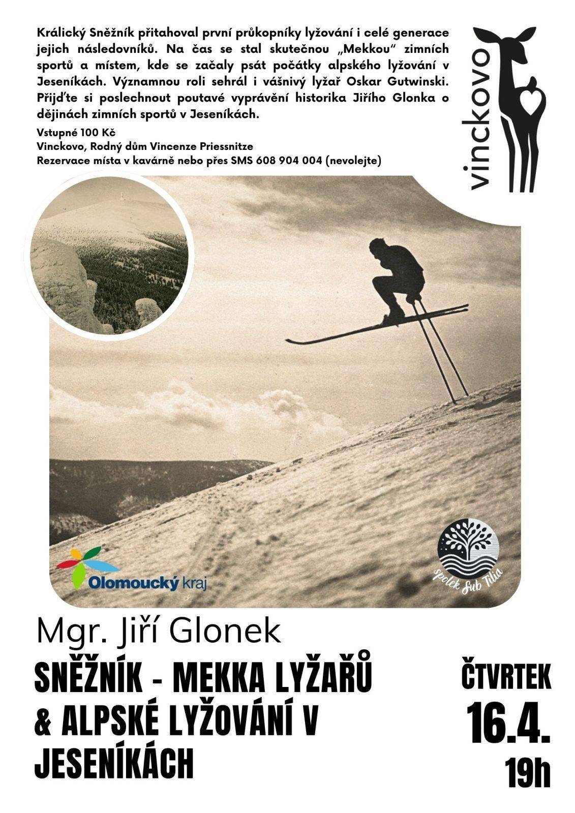 V průběhu přednášky nelze provádět individuální konzultace. Další přednášky akce dnes | Jarda Bouzek & Tomáš Šapovalov. REZERVACE MÍSTA NUTNÁ! 16.04.2026 od 16:00 do 18:00 hod. STŘECHA, Vrbno pod Pradědem | Mapa | | | Když se řekne opylovač, většina z nás si představí včelu medonosnou. 16.04.2026 od 18:00 do 19:00 hod. Vlastivědné muzeum Jesenicka - vodní tvrz, Jeseník | Mapa | | | Životní příběh rodáka v Vidnavy, jenž stál u zrodu moderní ortopedie. 16.04.2026 od 18:00 do 20:00 hod. Městské muzeum Rýmařov, Rýmařov | Mapa | | | Právě zde se začaly psát počátky alpského lyžování v celé Jesenické oblasti. Velkou zás 16.04.2026 od 19:00 do 21:00 hod. Vinckovo kafe, Jeseník | Mapa | |