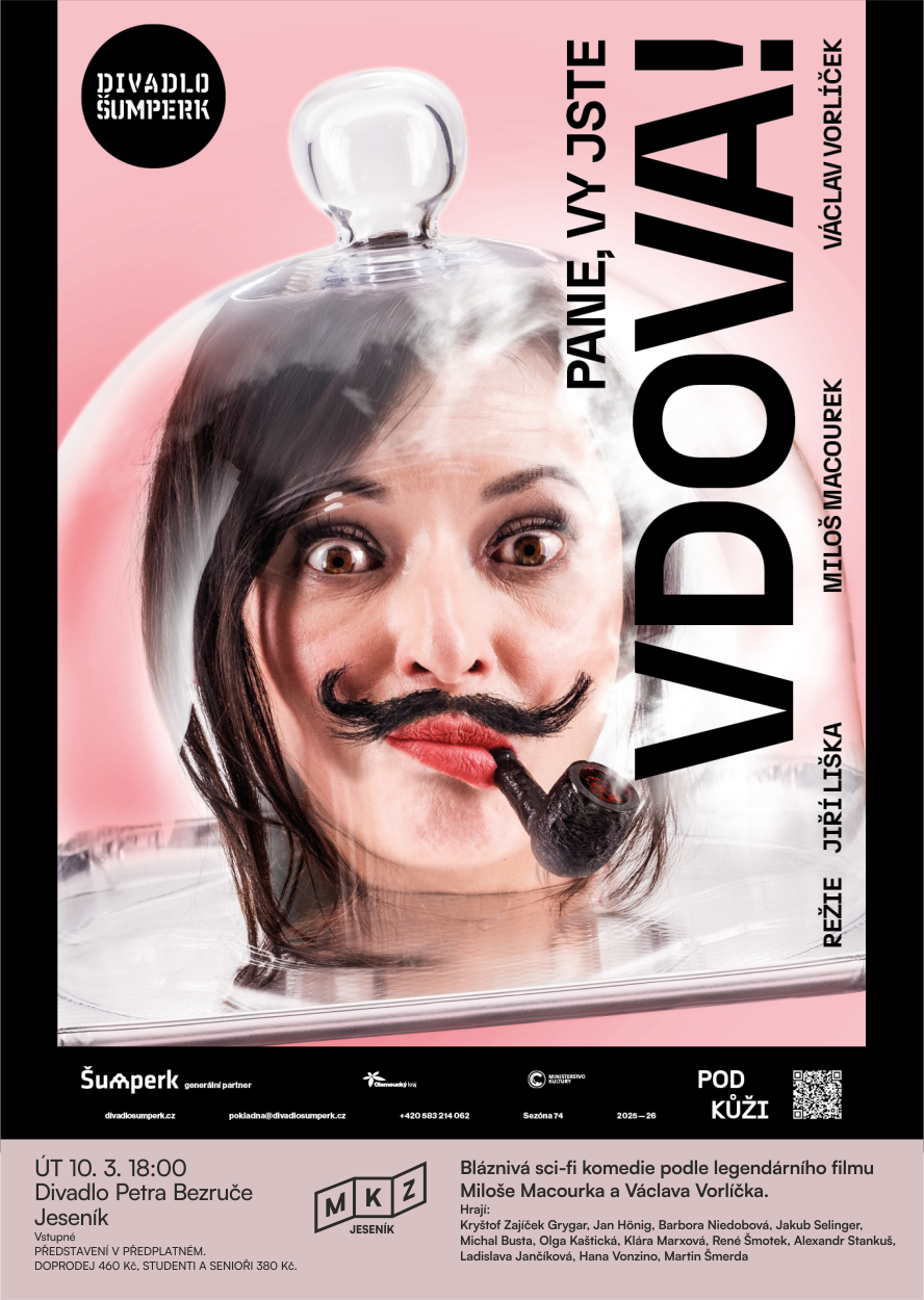 Adresa: 28. října 880/16 Jeseník Poslední změna: 26.01.2026 | úterý10.března PANE, VY JSTE VDOVA! - Divadlo 10.03.2026 od 18:00 do 20:00 hod. Di | Mapa Bláznivá retro gangsterka podle legendárního filmu Miloše Macourka a Václava Vorlíčka. Rozpustit neschopnou armádu, která způsobuje jen chaos a zmatky, se může na první pohled zdát jako dobrý nápad. Když se o to však pokusí královna Rosemary XV., stane se terčem sérií atentátů a pokusů o státní převrat. Vynalézaví spiklenci se vladařku pokouší odstranit nejrůznějšími způsoby, ale jejich nápaditost dalece převyšuje jejich schopnosti. No bodejť by ne. Královna má na své straně astrologa Hampla, který vždycky přesně a s předstihem ví, co se na ni chystá. Nastalá situace přináší bezpočet zmatků a brzy už nikdo nebude vědět, kde mu mozek stojí… Co je psáno ve hvězdách, se dozvíte v této bravurní sci-fi komedii v režii a jevištní úpravě režiséra Jiřího Lišky, jehož tvorba je doposud známá především dětem, a to díky šumperským inscenacím „Rychlebské pohádky“ a „Hrnečku, vař!“. Představení v produkci Divadla Šumperk. Hrají: Kryštof Zajíček Grygar, Jan Hönig, Barbora Niedobová, Jakub Selinger, Michal Busta, Olga Kaštická, Klára Marxová, René Šmotek, Alexandr Stankuš, Ladislava Jančíková, Hana Vonzino, Martin Šmerda Délka představení ca 120 minut s přestávkou. Představení v předplatném. Vstupné 460 Kč, studenti a senioři 380 Kč.