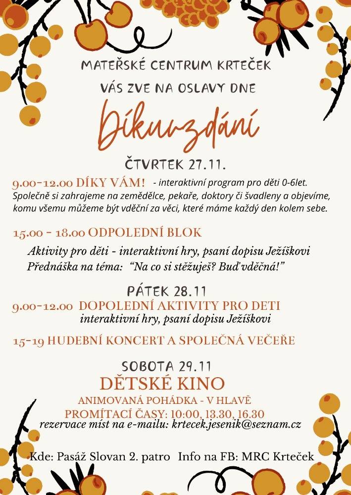Adresa: Masarykovo náměstí 19 / 6 79001 Jeseník Jeseník, Olomoucký kraj Česko Poslední změna: 21.11.2025 | pátek28.listopadu MATEŘSKÉ CENTRUM VÁS ZVE NA OSLAVY DNE DÍKUVZDÁNÍ - Divadlo 28.11.2025 od 09:00 do 19:00 hod. Alkron 2. patro, Jeseník | Mapa Díky Vám !