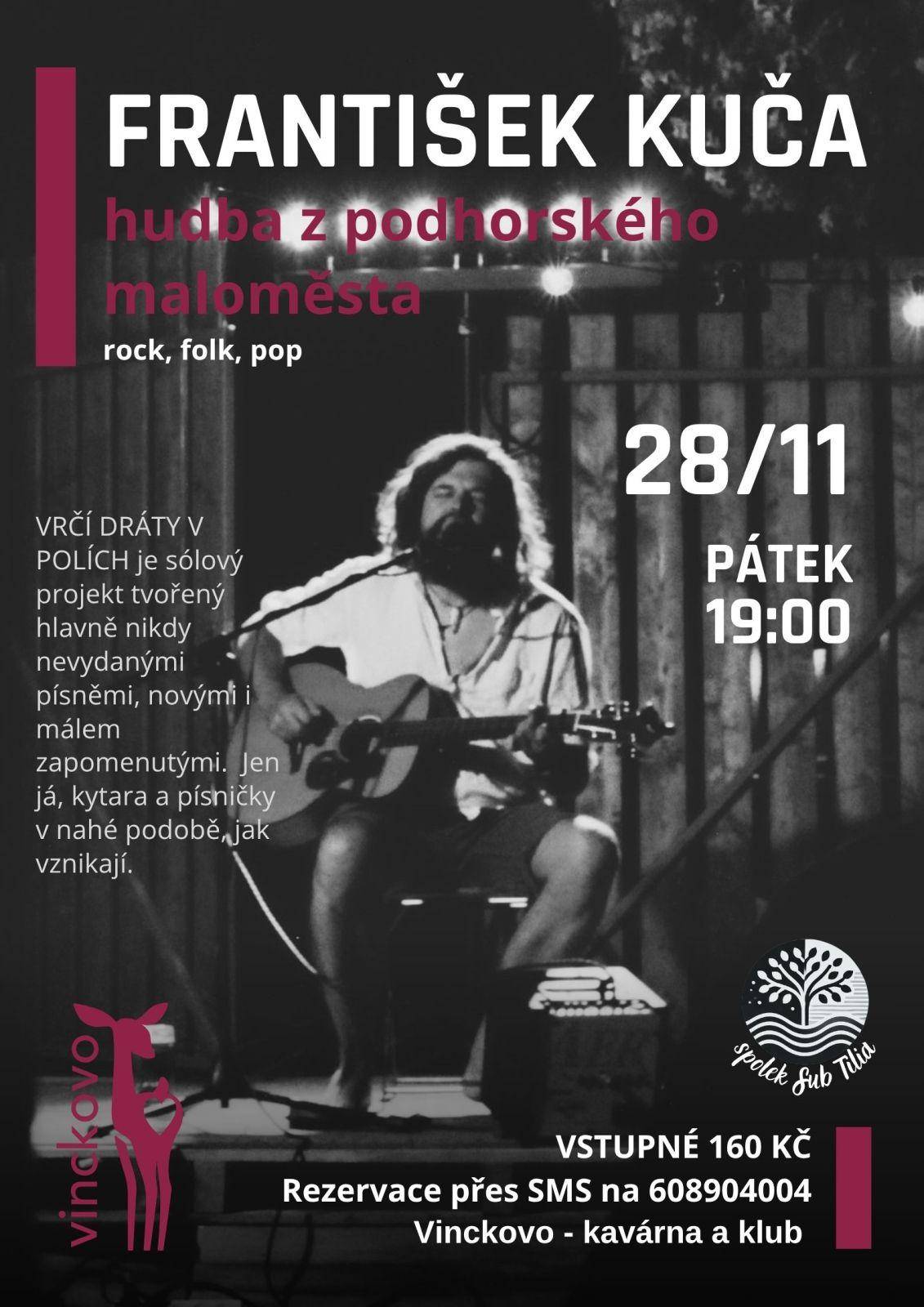 Adresa: Priessnitzova 175 / 37 79001 Jeseník Jeseník, Olomoucký kraj Česko Poslední změna: 05.11.2025 | František Kuča - Koncerty 28.11.2025 od 19:00 do 21:00 hod. Vinckovo kafe, Jeseník | MapaPísně z podhorského maloměsta, v nichž se mísí rock/folk/pop v podání kytaristy-textaře a redaktora ČRO. Vstupné 160 Kč. Další koncerty akce dnes | Koncert Javornického pěveckého sboru 09.12.2025 od 18:00 do 19:00 hod. kostel sv. kříže Javorník, Javorník | Mapa | |