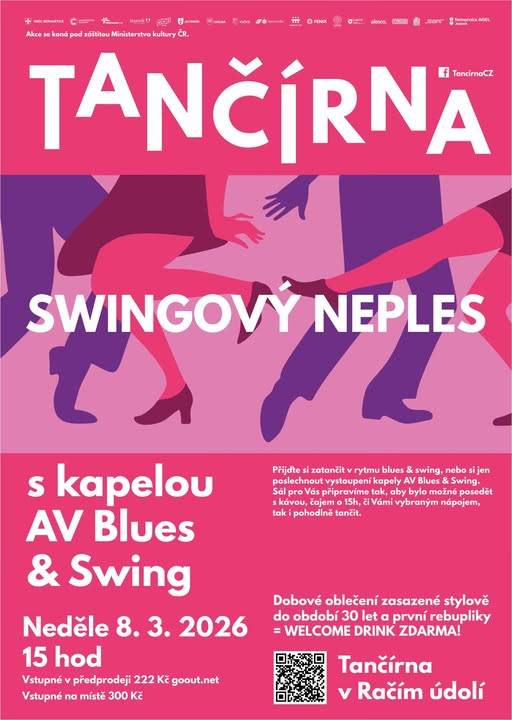 Adresa: 118 / 118 79070 Javorník Jeseník, Olomoucký kraj Česko Poslední změna: 06.01.2026 | neděle08.března SWINGOVÝ NEPLES V TANČÍRNĚ - Koncerty 08.03.2026 od 15:00 do 16:30 hod. Tančírna v Račím údolí, Javorník | Mapa Přijďte na taneček v termínu Mezinárodního dne žen! Swingová tančírna a koncert s kapelou AV Blues & Swing.Kdo přijde v dobovém oblečení zasazeném stylově do období 30 let a první rebupliky, má u nás welcome drink zdarma! Neděle 8.3.2026 – 15:00 Vstupné v předprodeji - 222Kč https://goout.net/cs/swingovy-neples-v-tancirne/szdmuey/ Vstupné na místě - 300 Kč FB událost zde: Foto album z poslední tančírny zde: https://www.facebook.com/media/set/?set=a.752846743523378&type=3 Přijďte zažít tančírnu v Tančírně!Zatančit si v rytmu blues & swing, nebo si jen poslechnout vystoupení kapely AV Blues & Swing.Sál pro Vás připravíme tak, aby bylo možné posedět s kávou, "čajem o třetí", či Vámi vybraným nápojem, tak i pohodlně tančit.AV Blues & Swing: Dva zkušení muzikanti hrají směs blues, swingu, písní První republiky, dixielandu, písní éry divadla Semafor, a vybraných písní skupiny Beatles v Blues a Swing aranžmá. Repertoár kapely je velmi široký a vy se jistě nudit nebudete. Zde je link na repertoár, který se kapele neustále rozšiřuje: https://bandzone.cz/avbluesandswing?at=info Zde je pro ilustraci teaser z živých produkcí: Kapela hraje ve složení: Aleš Nitra - zpěv, kytary, tenor banjo a foukací harmoniky https://www.facebook.com/alesnitra&Vláďa Vondráček - housle, klávesy, vokály. https://www.facebook.com/vladimir.vondracek.58