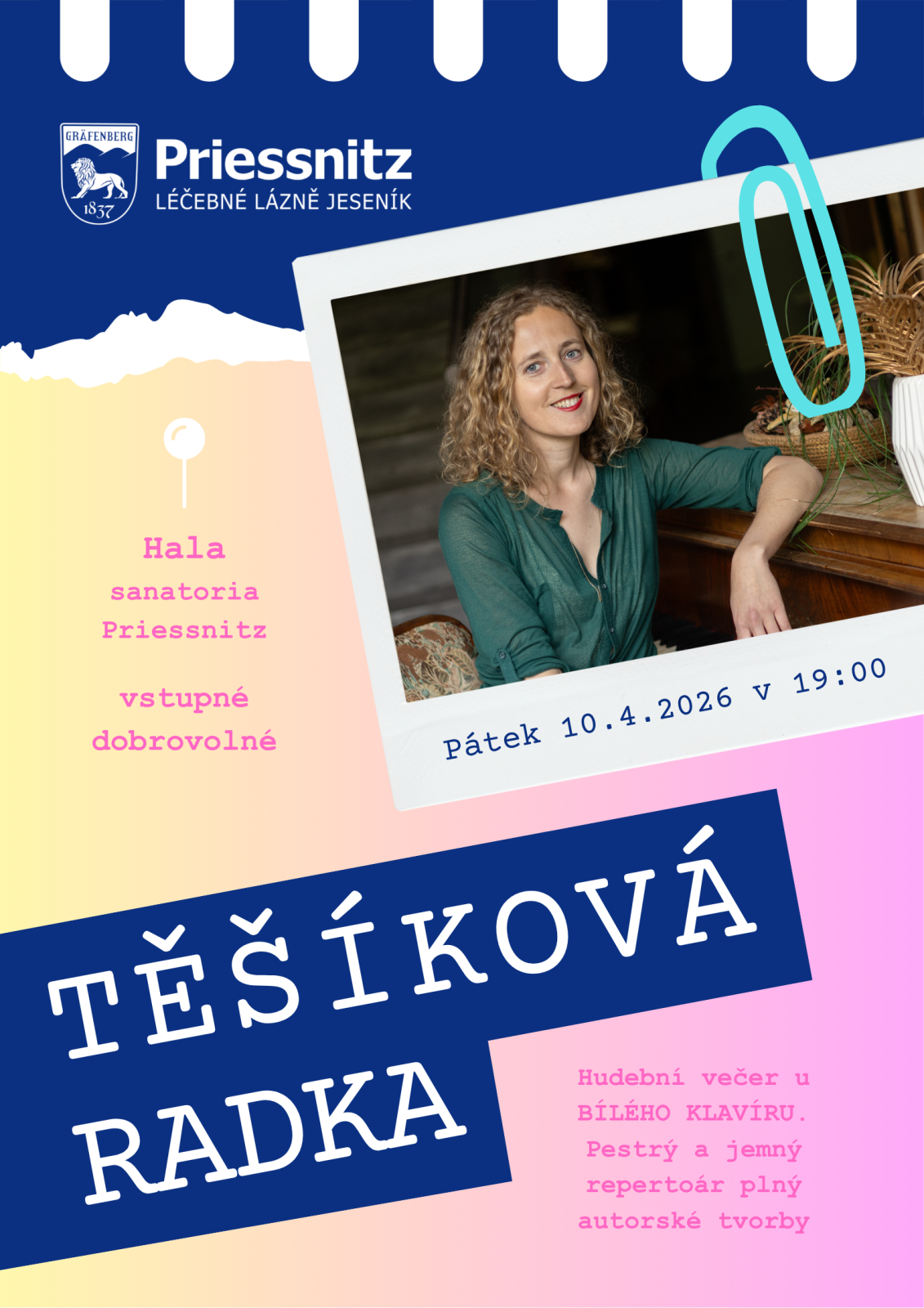 Adresa: Priessnitzova 913 / 26 79001 Jeseník Jeseník, Olomoucký kraj Česko Poslední změna: 27.03.2026 | SETKÁNÍ U BÍLÉHO KLAVÍRU - Koncerty 10.04.2026 od 19:00 do 20:00 hod. Priessnitzovy léčebné lázně a.s., Hala lázeňského domu Priessnitz, Jeseník | MapaPřijměte pozvání na setkání se zpěvačkou, klavíristkou, autorkou písní a violoncellistkou Radkou Těšíkovou. Vstupné dobrovolné Další koncerty akce dnes | Screamers - 30 let na scéně. 27.03.2026 od 19:00 do 21:00 hod. Městské divadlo Bruntál, Bruntál | Mapa | | | Od Blackmore’s Night po ABBA, Irglová a Hansard i Zaz: dva hlasy a kytara. Potkali se na hřišti 27.03.2026 od 19:00 do 21:00 hod. Vinckovo kafe, Jeseník | Mapa | |