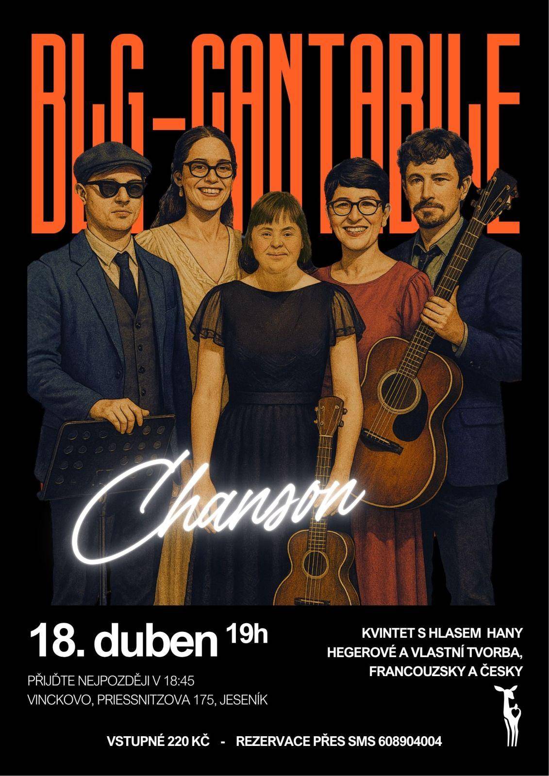 Adresa: Priessnitzova 175 / 37 79001 Jeseník Jeseník, Olomoucký kraj Česko Poslední změna: 30.03.2026 | BLG-CANTABILE ŠANSON - Koncerty 18.04.2026 od 19:00 do 21:00 hod. Vinckovo kafe, Jeseník | MapaKvintet s hlasem Hany Hegerové, který vás dojme k slzám. Francouzsky i česky,tři zpěváci, ukulele, kytara, klavír, perkuse. Vstupné 220 Kč. Další koncerty akce zítra | vystoupí žáci ZUŠ Jeseník 31.03.2026 od 17:00 do 19:00 hod. Kaple Jeseník - koncertní sál ZUŠ Jeseník, Jeseník | Mapa | |