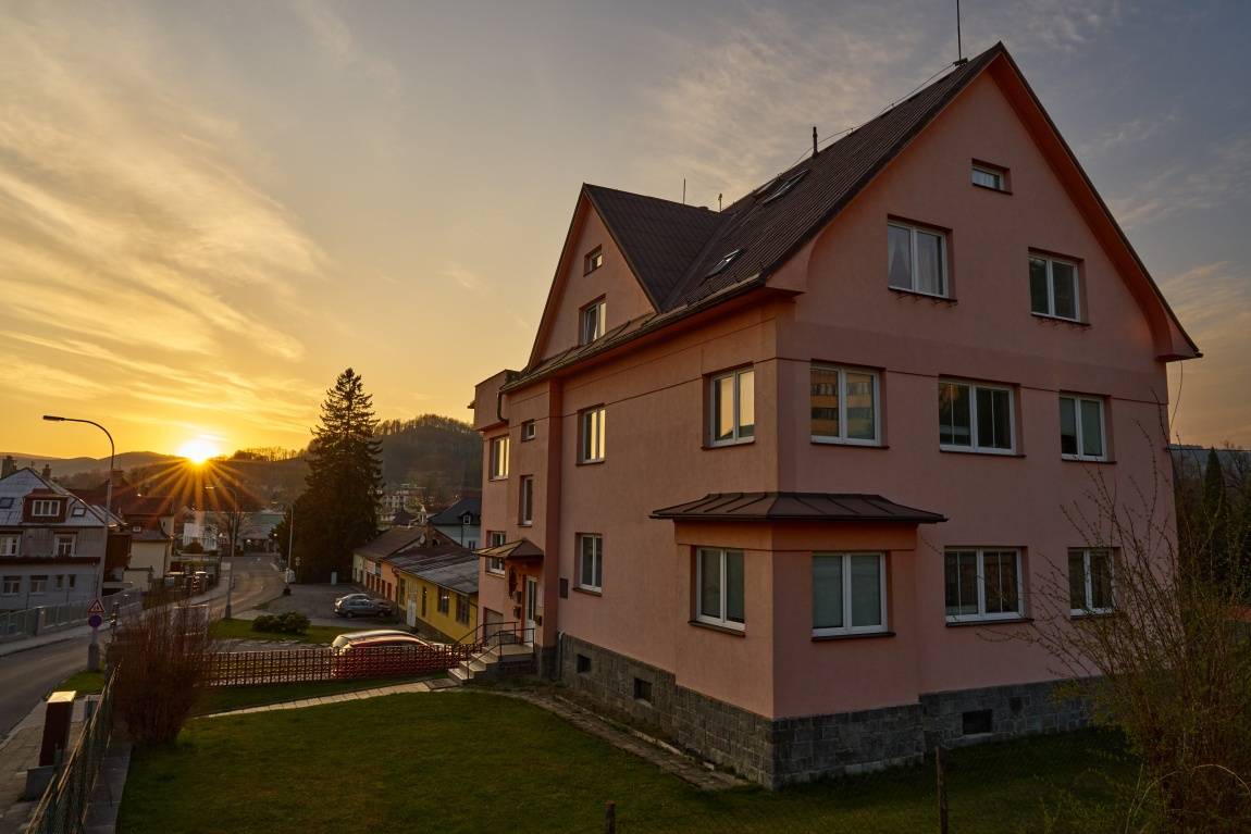 Vila se nachází v centru města Jeseník, a přitom v klidné části sousedící s městským parkem s tenisovými kurty, dětským hřištěm, 2 minuty chůze od autobusového a 15 min od vlakového nádraží. Z okna Vás odmění pohled na pohoří Hrubého Jeseníku s nejvyšším vrcholem Praděd. Výhodnou polohu vily ocení nejen rodiny s dětmi, ale všechny věkové skupiny, neboť v blízkém okolí najdou všechno to, co je k relaxaci a spokojenému pobytu potřeba včetně blízkých kaváren, restaurací či obchodů. Každý si zde najde to své!.