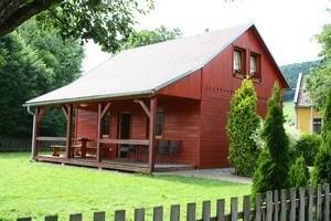 Nově postavená dřevěná chata stojí na prostorném zatravněném pozemku se stromy a keři na okraji osady. Kolem kůlny u příjezdové komunikace se dostaneme po chodníku na kryté zápraží objektu, odkud vstupujeme do předsíně (věšáková stěna), za kterou se nachází společenská místnost (pohovka, stolek, TV+DVD). Její součástí je jídelní kout (stůl, židle) a kuchyňka (linka, lednice), vedou odsud dveře do koupelny s WC a schodiště do podkroví. Z podkrovní chodbičky (odkládací plochy) jsou přístupné shodně vybavené ložnice A, B a C (lůžka, noční stolky s lampičkami, skříňka). Objekt je nový, vybavený světlým nábytkem, který dotváří příjemnou atmosféru. V prostorné zahradě mají hosté možnost posezení u otevřeného ohniště a možnost grilování.