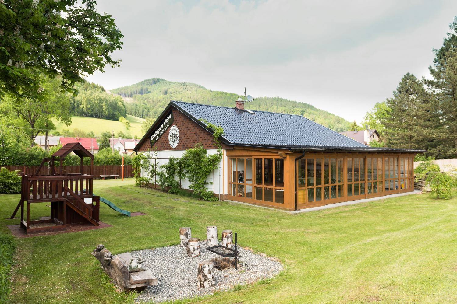K dispozici ubytování ve dvou chalupách, které jsou na společném oploceném pozemku. První chalupa je bezbariérová přízemní stavba až pro 10 osob. Nachází se zde obývák s krbem, posezením s TV, jídelna, vybavená bezbariérová kuchyně, 2x WC, koupelna se sprchovým koutem a bezbariérovou vanou. Druhá chalupa má kapacitu 13 lůžek ve čtyřech ložnicích. V přízemí se nachází velká ložnice po 4 lůžkách a prostorná kuchyně, která slouží zároveň jako společenská místnost na níž navazuje dětská herna, koupelna a WC. V patře se nachází společenská místnost s TV, koupelna, WC a 3 ložnice každá pro 3 osoby. V každé chatě se nachází prosklená zimní zahrada, která není vytápěná s ping-pongovým stolem a vlastní vířivkou. Na zahradě má každá chalupa vlastní soukromé posezení u ohniště, vlastní pískoviště, houpačku, skluzavku a domeček pro děti. Dále hřiště pro míčové hry a nadzemní venkovní bazén je pro obě chalupy společné.