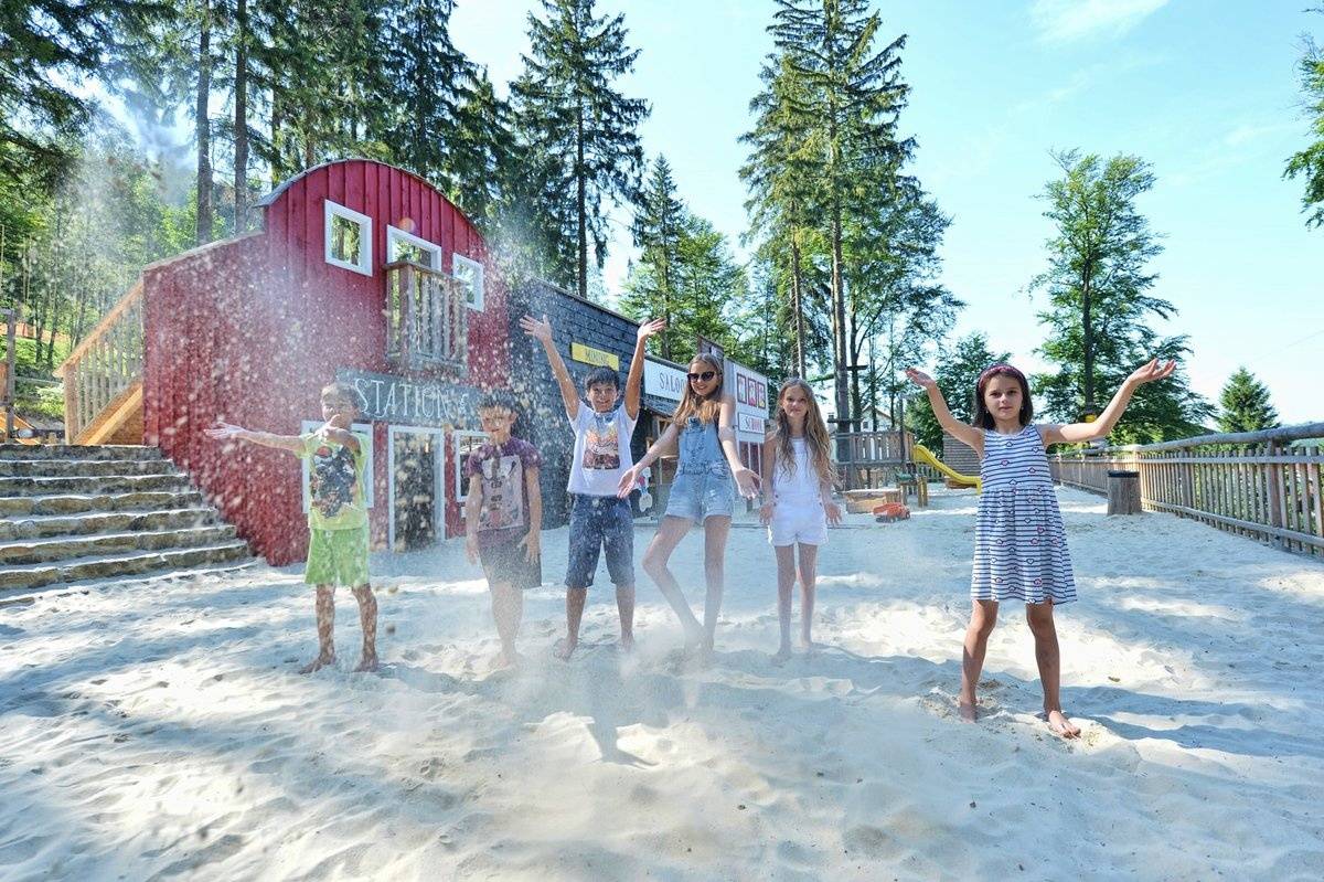 Zažijte atmosféru skutečného divokého západu se stavbami, které jako by vypadly z westernového filmu. Můžete je prozkoumat přes síť, lezeckou stěnu, žebřík nebo skluzavkou ven. Pustit se můžete i do archeologických vykopávek z doby lovců mamutů za pomoci pracovních pomůcek pro malé archeology. Podaří se vám vykopat celou kostru mamuta? Najdete tu dokonce pískový vlak, který vám po kolejích přepraví písek na pískové dopravníky, kde s nim můžete dál pracovat za pomoci kbelíků a zvedacích systémů. V dřevěných kadích si vyzkoušejte rýžování zlata a alespoň na chvíli se stáňte malým zlatokopem. Pokud se životem na divokém západě unavíte, dopřejte si svezení na kolotoči a houpačce nebo si vytvořte zvířecí stopy z písku.