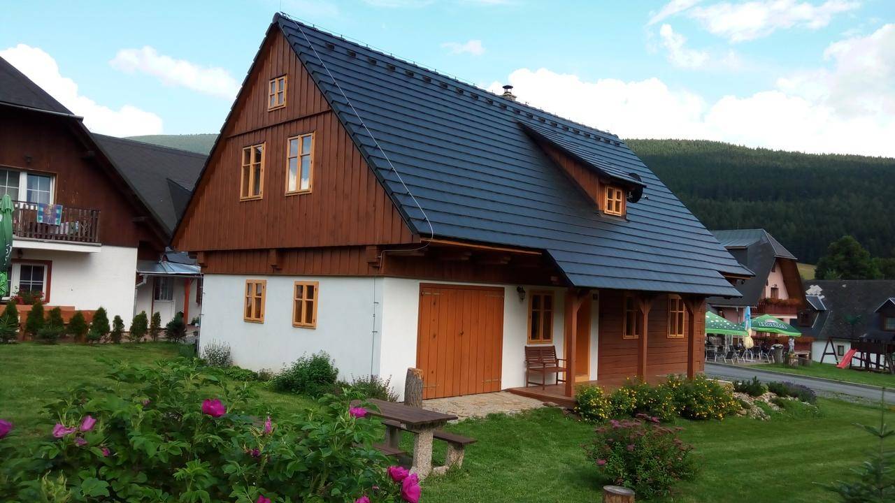 K dispozici ubytování ve 3 pokojích (2x třílůžkový, 1x čtyřlůžkový). Pokoje jsou umístěny v 1. patře a jsou vybaveny postelemi, nočními stolky, šatními skříněmi. V přízemí se nachází prostorná společenská místnost s kachlovými kamny, televizí, DVD a kuchyňskou linkou (indukční varná deska, programovatelná trouba, chladnička s malým mrazícím boxem, myčka nádobí, mikrovlnná trouba, kávovar). Dále je zde garáž, kde je možné uschovat kola nebo lyže. V roubence se nachází 2 koupelny s WC, jedna je v přízemí a druhá v prvním patře. Možnost zapůjčení dětské postýlky. K dispozici je zahradní gril, který je možnost využít u venkovního posezení s ohništěm, dětské hřiště, klouzačka, pískoviště.